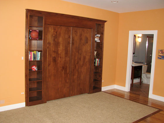 As seen on TV murphy bed kit, knotty pine constructed vertical Murphy bed with custom side cabinets.