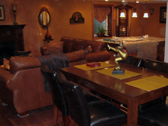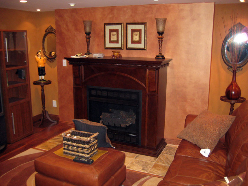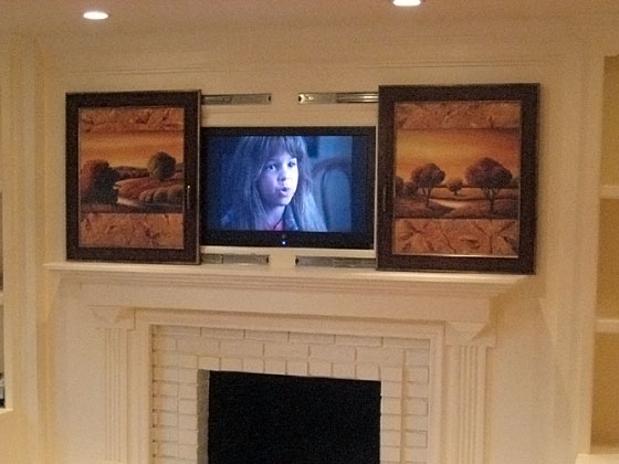 Newly constructed mantel, with fluted trim, and custom inset TV behind two pictures.