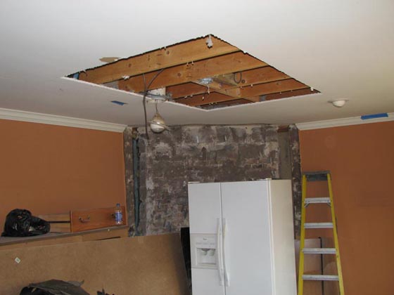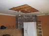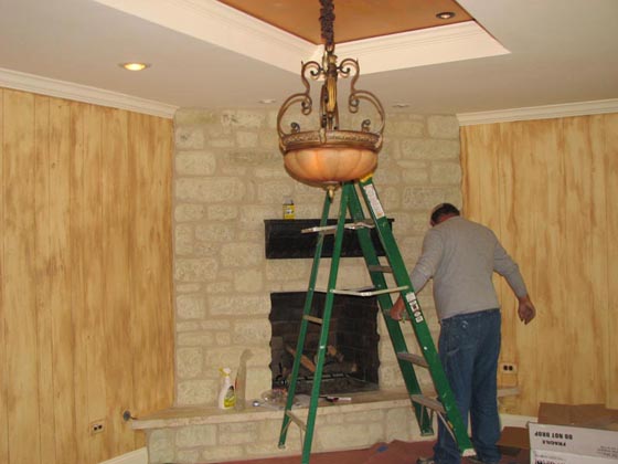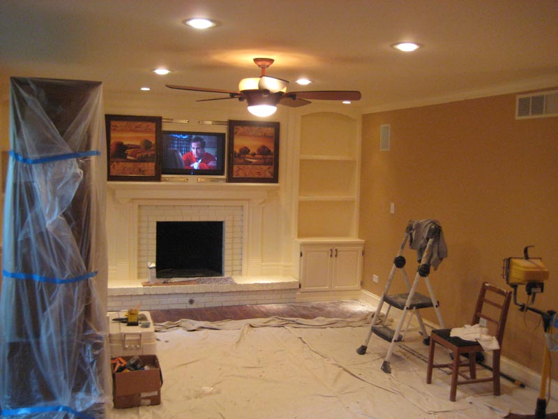 Newly constructed fireplace with steel mantel, finished tray ceiling with lighted crown trim and specified lighting.